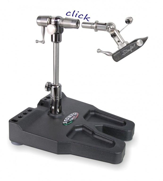 The Transformer is a high technology product that thanks to a fast coupling device on the shaft can be transformed from in-line vice to tube-fly vice or streamer vice. Three vices in one with just a click. The stainless steel shaft is in-line full rotary by dual precision ball bearings. All parts of three vices are included with Transformer. The new steady pedestal base has a useful integrated tool rack. Other important Transformer features: interchangeable jaws, adjustable rotary tension, smooth rotary motion, locking position at any angle, shaft fast locking every 45 degree angle, adjustable height, reversible for left hand tying. Other accessories included: rounded shape bobbin cradle, parachute plier, adjustable spring material clip, pivot thread cradle, allen keys and instruction manual.